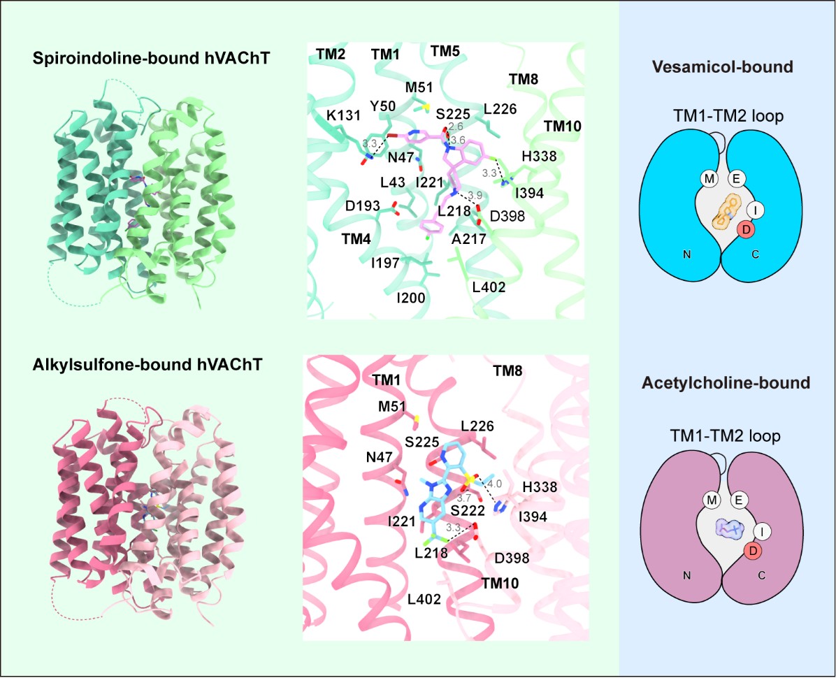 北京大学生命科学学院和生命科学联合中心张哲课题组于2025年10月30日在Structure期刊上发表题为“Structural basis of VAChT inhibition by spiroindolines and alkylsulfones”的研究论文。该研究通过冷冻电镜解析了人源VAChT蛋白与两种新型抑制剂——Spiroindoline和Alkylsulfone结合的高分辨率结构,并结合功能实验系统阐明其抑制机制。结合课题组此前发表的VAChT与底物及Vesamicol结合的结构(Zhang et al. Cell Research 2024),本研究完整揭示了VAChT在识别不同配体过程中的构象偏好与结合模式差异(图1)。