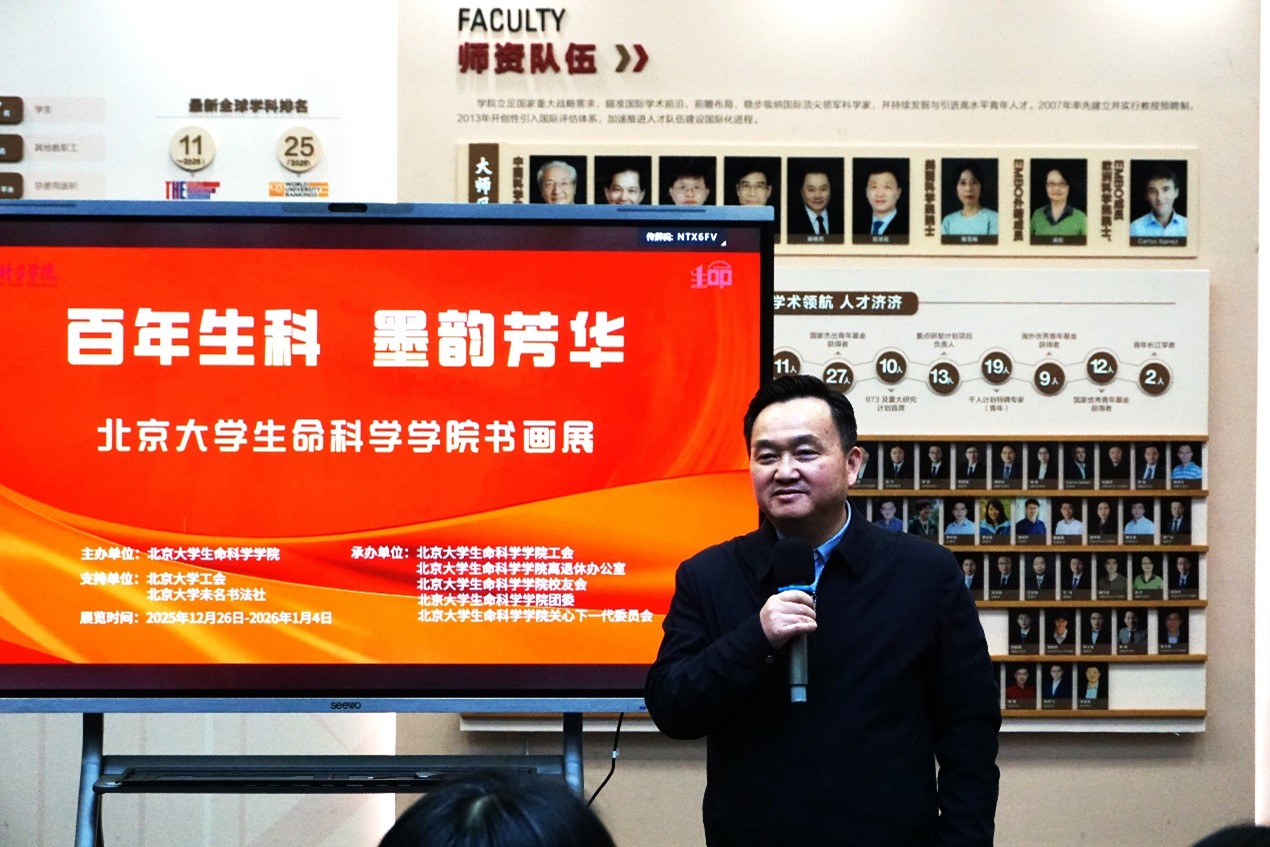 2025年12月26日,“百年生科·墨韵芳华”—北京大学生命科学学院书画展在金光楼(理科四号楼)开幕。北京大学工会常务副主席张宝岭,党委宣传部副部长唐平,工会副主席张小萌,工会原副主席、医学部工会原常务副主席刘穗燕,化学与分子工程学院教授、未名书法社社长、校友书画协会副会长沈兴海,工会文体部部长朱博雅,生命科学学院院长陈雪梅,党委书记石长翼,中国科学院院士、生命科学学院教授赵进东,党委副书记郑晓峰,党委副书记曲一铭,北京大学工会副主席(兼)、生命科学学院工会主席范六民,院长助理彭宜本,以及学院教师代表、离退休教师代表和学生代表等出席。